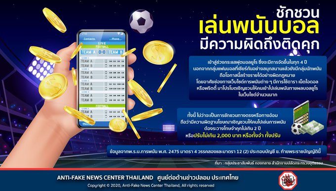 5. ติดคุก – ผู้เล่น ผู้ชักชวน และผู้จัดให้มีการพนันฟุตบอลจะมีความผิดตาม พ.ร.บ.การพนัน พ.ศ.2478 มาตรา 12(2) ต้องระวางโทษจำคุกไม่เกิน 2 ปี หรือปรับไม่เกิน 2,000 บาท หรือทั้งจำทั้งปรับ