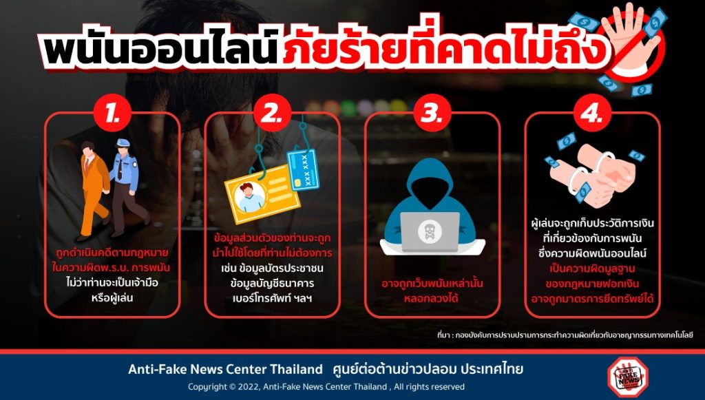4. เสียรู้ – การสมัครสมาชิกและเล่นการพนันในเว็บไซต์การพนันผิดกฎหมาย อาจทำให้ข้อมูลส่วนตัว ชื่อผู้ใช้ รหัสผ่าน และข้อมูลอื่น ๆ ถูกนำไปใช้ในการกระทำความผิด และอาจถูกโกงไม่สามารถถอนเงินจากเว็บพนันได้
