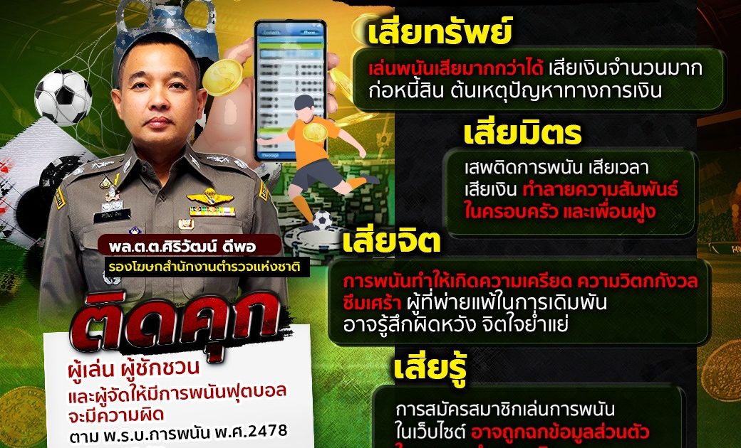 สำนักงานตำรวจแห่งชาติจึงขอให้พี่น้องประชาชนรับชมการแข่งขันฟุตบอลอย่างสร้างสรรค์ อย่าหลงผิดไปเล่นพนันฟุตบอล เพราะผลเสียที่จะตามมานั้นมีมากมาย เช่น