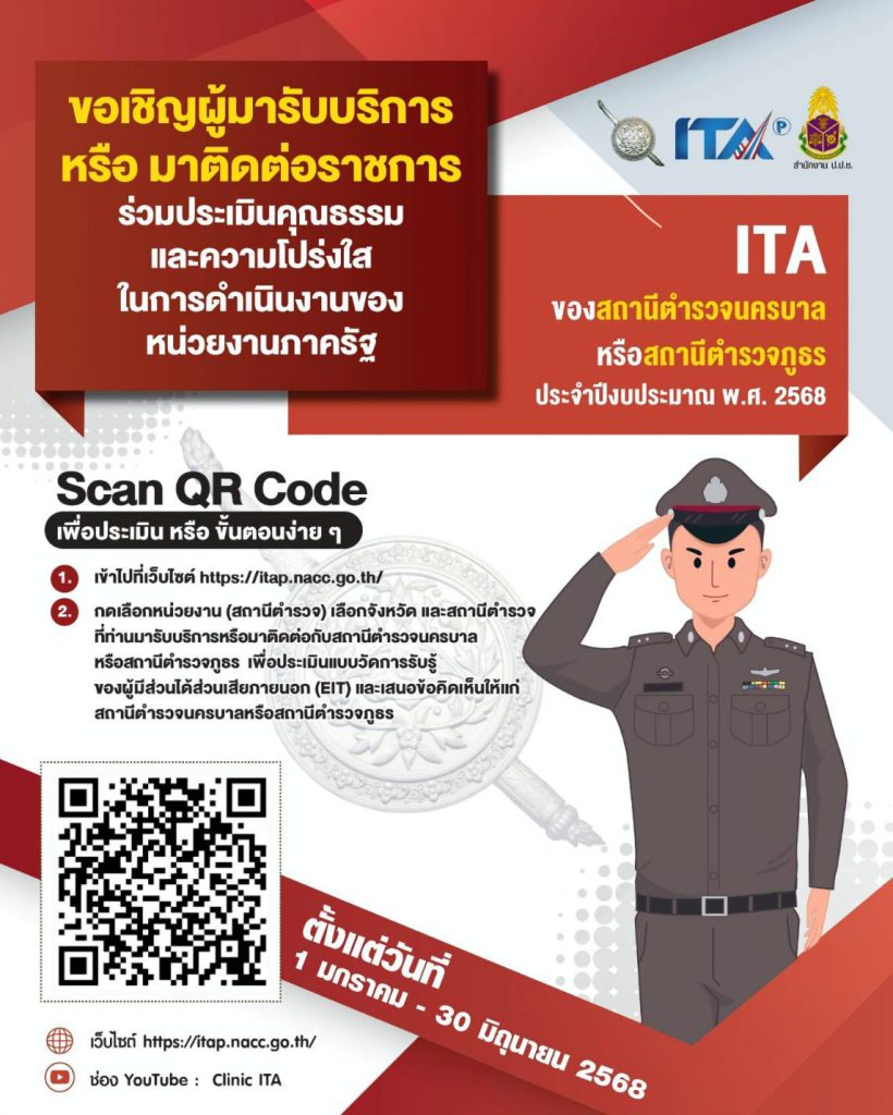– ให้สถานีตำรวจประชาสัมพันธ์เกี่ยวกับการประเมินคุณธรรมและความโปร่งใสในการ ดำเนินงานของหน่วยงานภาครัฐ (Integrity & Transparency Assessment: ITA) ของสถานีตำรวจ ให้แก่ ประชาชน ผู้มาใช้บริการประจำจุดประชาสัมพันธ์ ให้คำแนะนำและขอความร่วมมือในการทำแบบวัดการรับรู้ของผู้ มีส่วนได้ ส่วน เสียภายนอก (EIT)