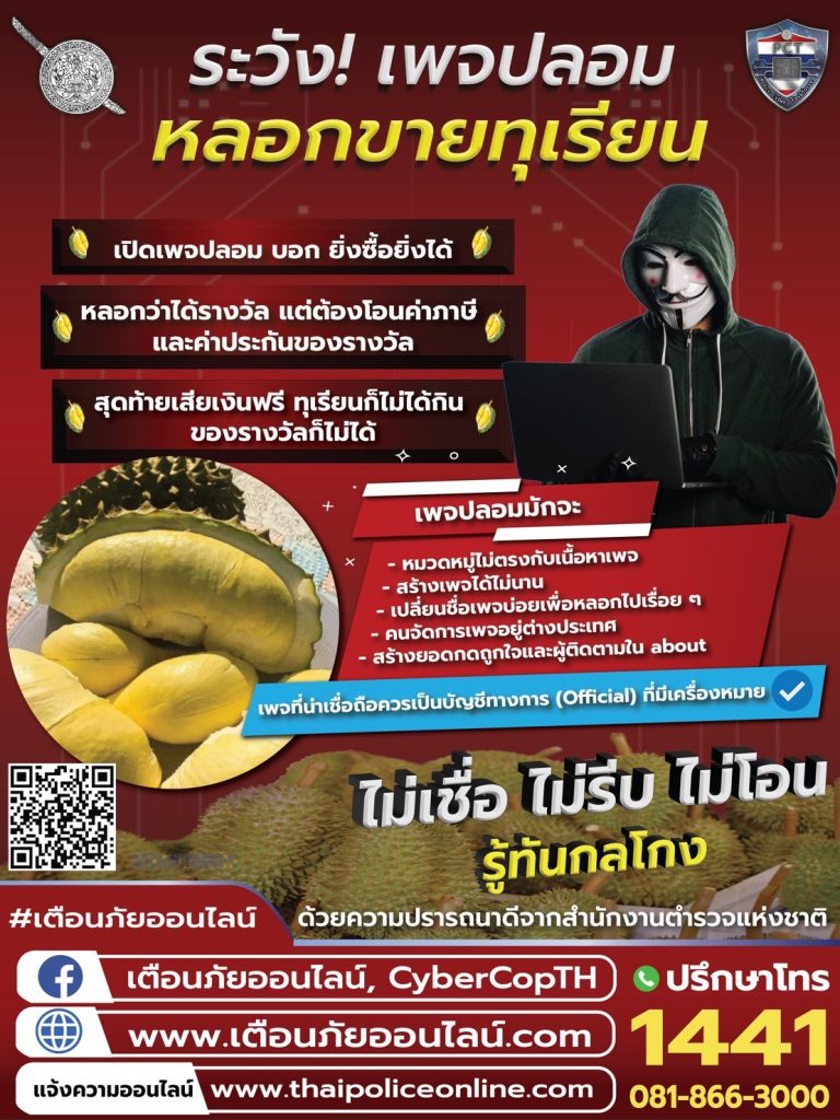 เตือนภัยเพจปลอม หลอกขายทุเรียนออนไลน์ 12 มิถุนายน 2566 โดย admin / การมีส่วนร่วมของหัวหน้าสถานี Facebook iconFacebookTwitter iconTwitterLINE iconLine